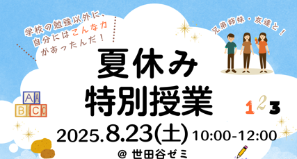 2025年08月23日 @ 10:00 – 12:00 – 世田谷線 世田谷駅から徒歩30秒! 発達障がい、学習障がい、不登校の生徒さんを積極的に受け入れる、 1対1の完 […]